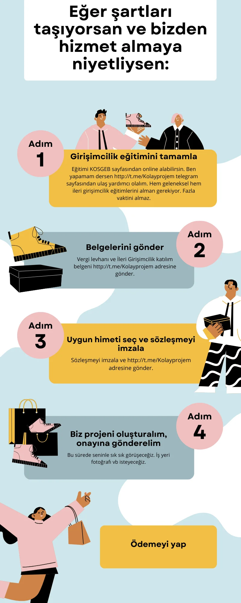 Biz başvurularınızı oluşturmanıza ve video hazırlamanıza rehberlik ediyoruz. Telegram http://t.me/Kolayprojem hesabımızdan iletişime geçin ve hizmetlerimiz hakkında bilgi alın.